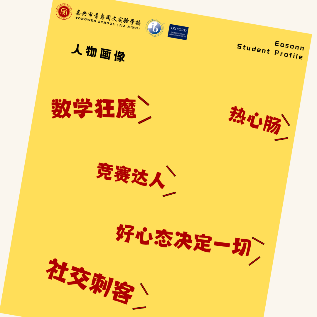 Eason是人盡皆知的數學大神。10年級剛開始的時候他就自學完了IGCSE所有的數學指導,并利用晚自修時間,給同班的六名同學(模考成績在D)輔導IGCSE數學,包括幾何、代數和函數。所有學生最后在IGCSE正式考試中都取得了B的成績。11年級的π日,他受邀向小學生分享了自己的數學學習經驗,利用卡通的形式將復雜的數學問題簡單化。12年級在各個DDL的催促下,他每周還會用一個晚自修的時間帶領10年級的學弟學妹們打SIC競賽。即使在壓力爆棚的IBDP全球統(tǒng)考考試期間,他仍會花自己的時間為同學耐心地講解數學題。