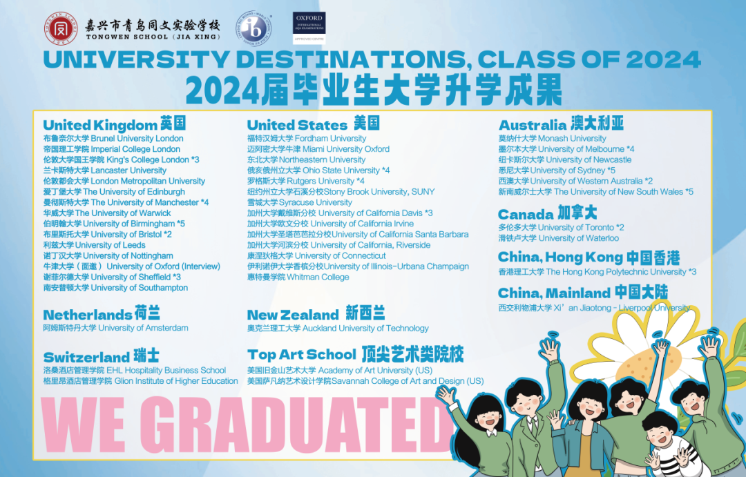 截至2024年6月10日嘉興市青鳥同文實(shí)驗(yàn)學(xué)校第6屆畢業(yè)生向英國、美國、中國香港、澳大利亞、加拿大、新西蘭、法國、日本等國家或地區(qū)的院校遞交了申請(qǐng)。在目前已公布的結(jié)果中,共計(jì)獲得125份錄取,累計(jì)約340,700美金獎(jiǎng)學(xué)金。專業(yè)涵蓋金融與會(huì)計(jì)、市場營銷、酒店管理、機(jī)械工程、數(shù)學(xué)、統(tǒng)計(jì)學(xué)、數(shù)據(jù)科學(xué)、計(jì)算機(jī)科學(xué)、經(jīng)濟(jì)學(xué)、環(huán)境科學(xué)、交互設(shè)計(jì)、平面設(shè)計(jì)等。
