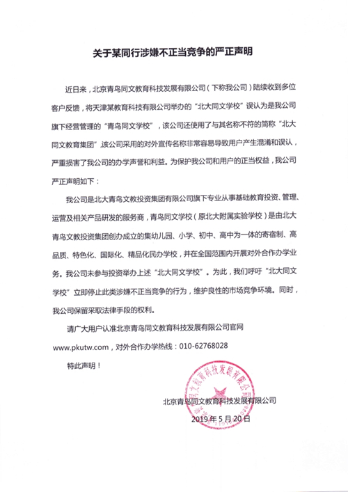 我公司是北大青鳥文教有限公司旗下專業(yè)從事基礎(chǔ)教育投資、管理、運營及相關(guān)產(chǎn)品研發(fā)的服務(wù)商,青鳥同文學(xué)校(原北大附屬實驗學(xué)校)是由北大青鳥文教創(chuàng)辦成立的集幼兒園、小學(xué)、初中、高中為一體的寄宿制、高品質(zhì)、特色化、國際化、精品化民辦學(xué)校,并在全國范圍內(nèi)開展對外合作辦學(xué)業(yè)務(wù)。我公司未參與投資舉辦上述“北大同文學(xué)校”。為此,我們呼吁“北大同文學(xué)校”立即停止此類涉嫌不正當競爭的行為,維護良性的市場競爭環(huán)境。同時,我公司保留采取法律手段的權(quán)利。
